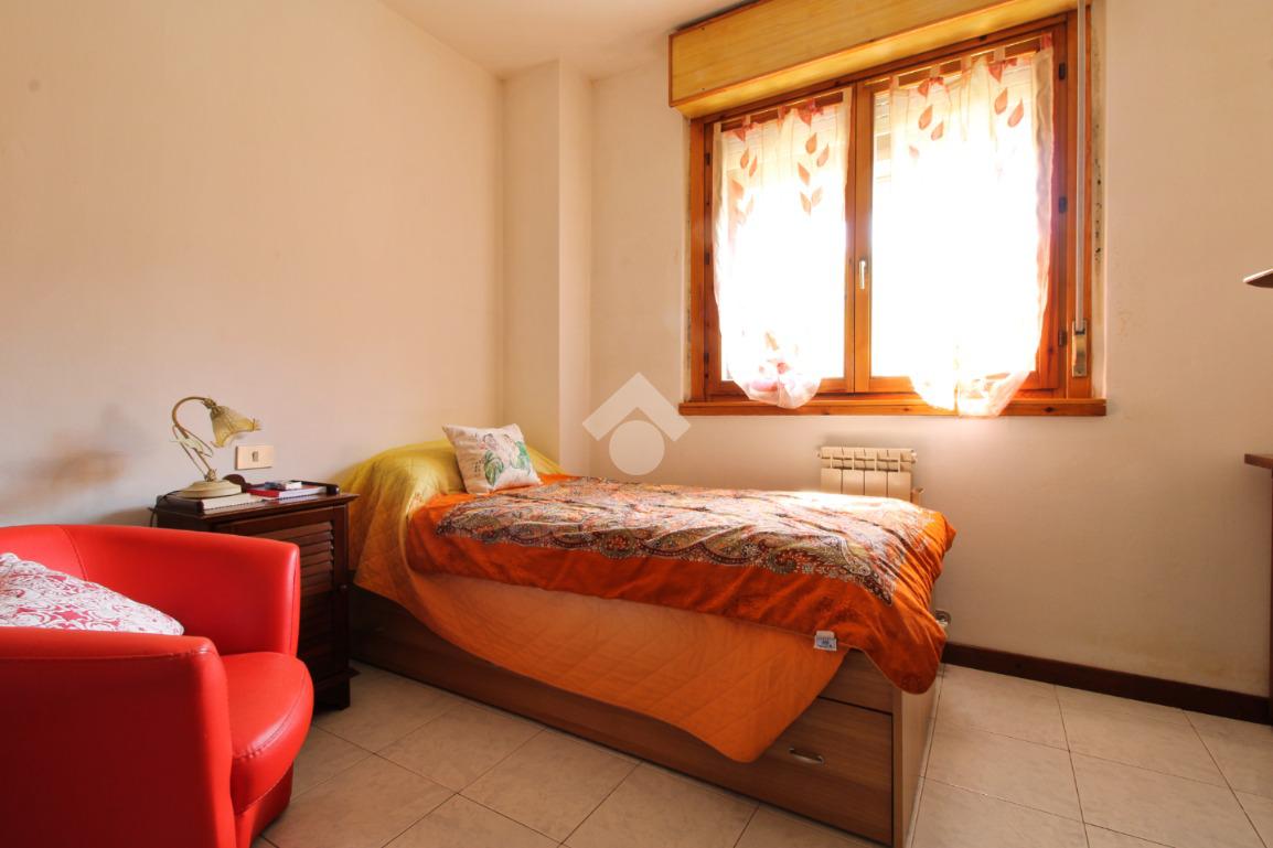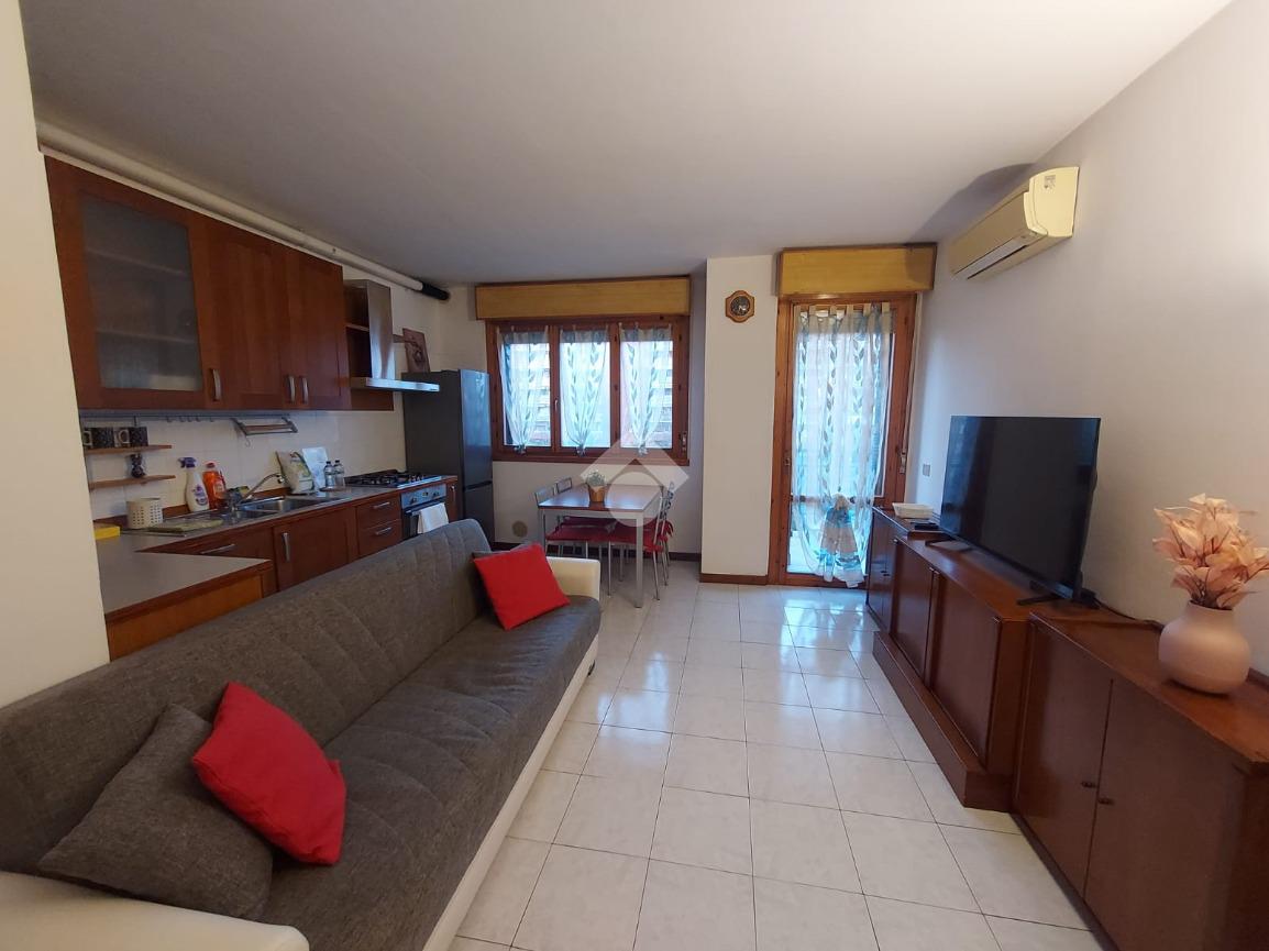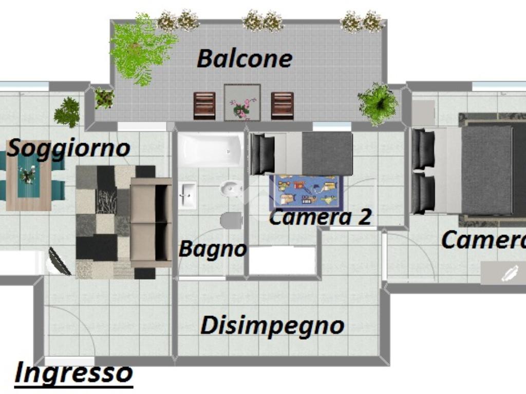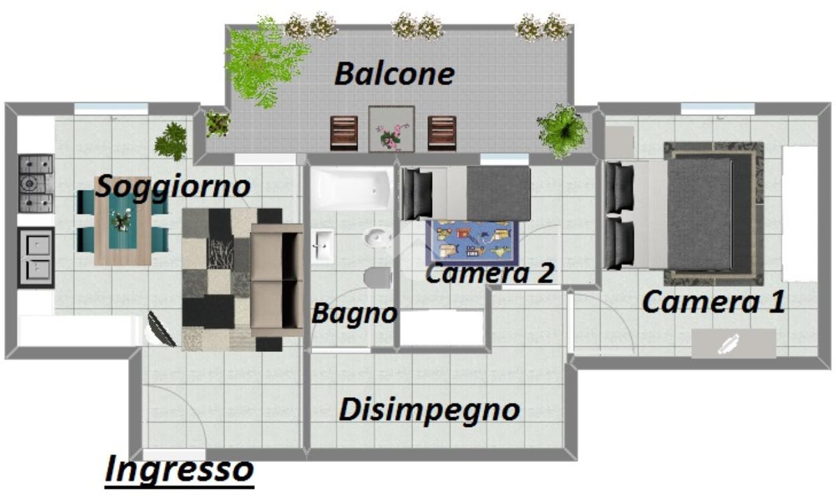 Residenze La Grande, appartamento di tre locali posto al secondo piano composto da soggiorno con cucina a vista e balcone che affaccia all'interno del giardino condominiale, bagno finestrato, camera matrimoniale e cameretta.